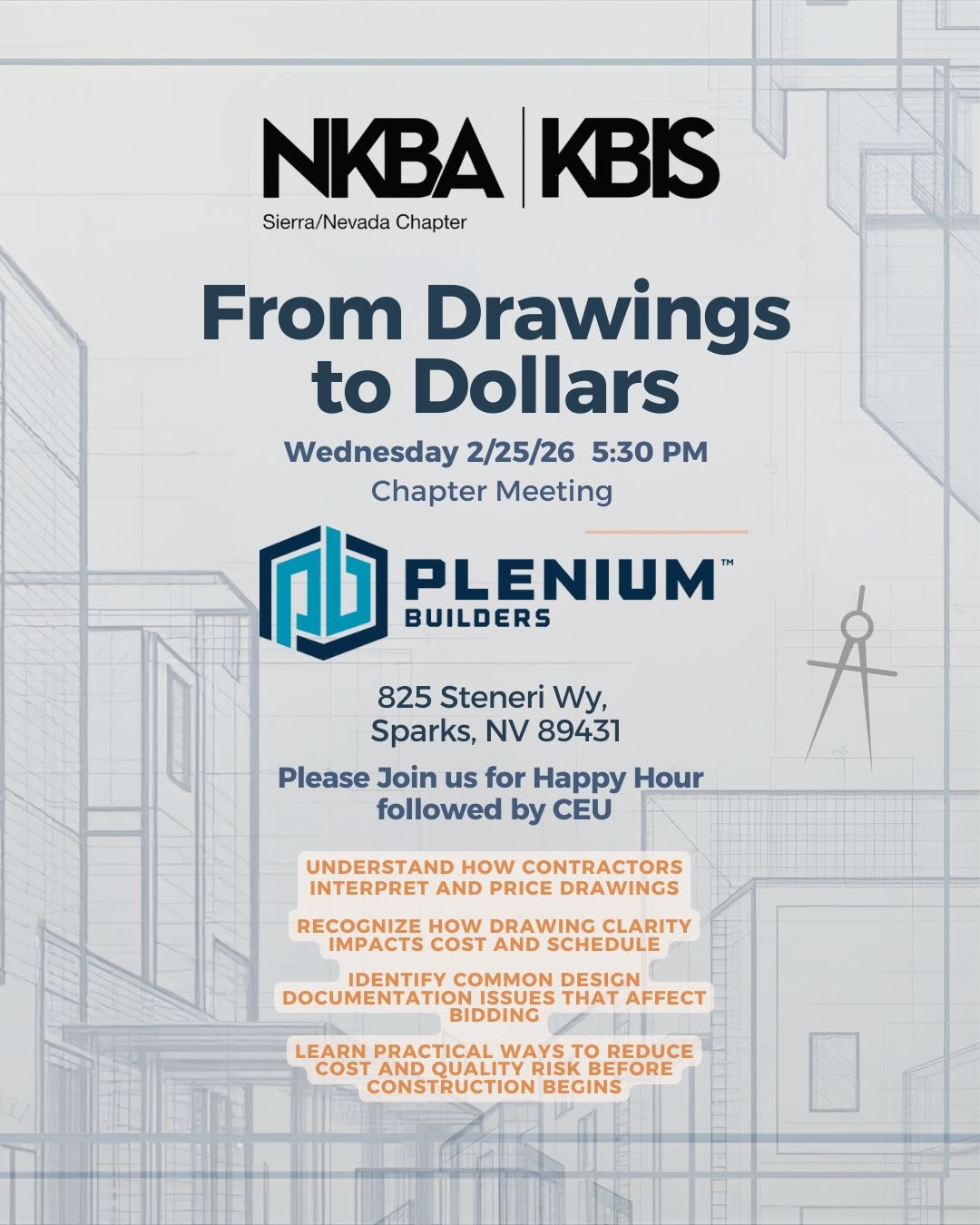 From Drawings to Dollars is an NKBA educational event hosted at Plenium Builders, designed to give designers and industry professionals a behind-the-scenes look at how builders interpret plans, assess risk, and price projects in the real world.