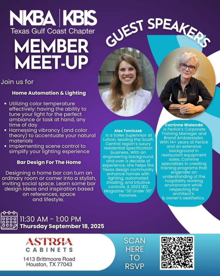 Discover smart lighting strategies and stylish home bar inspiration at the NKBA TGCC Member Meet-Up on September 18, 2025, at ASTRRA Cabinets in Houston.