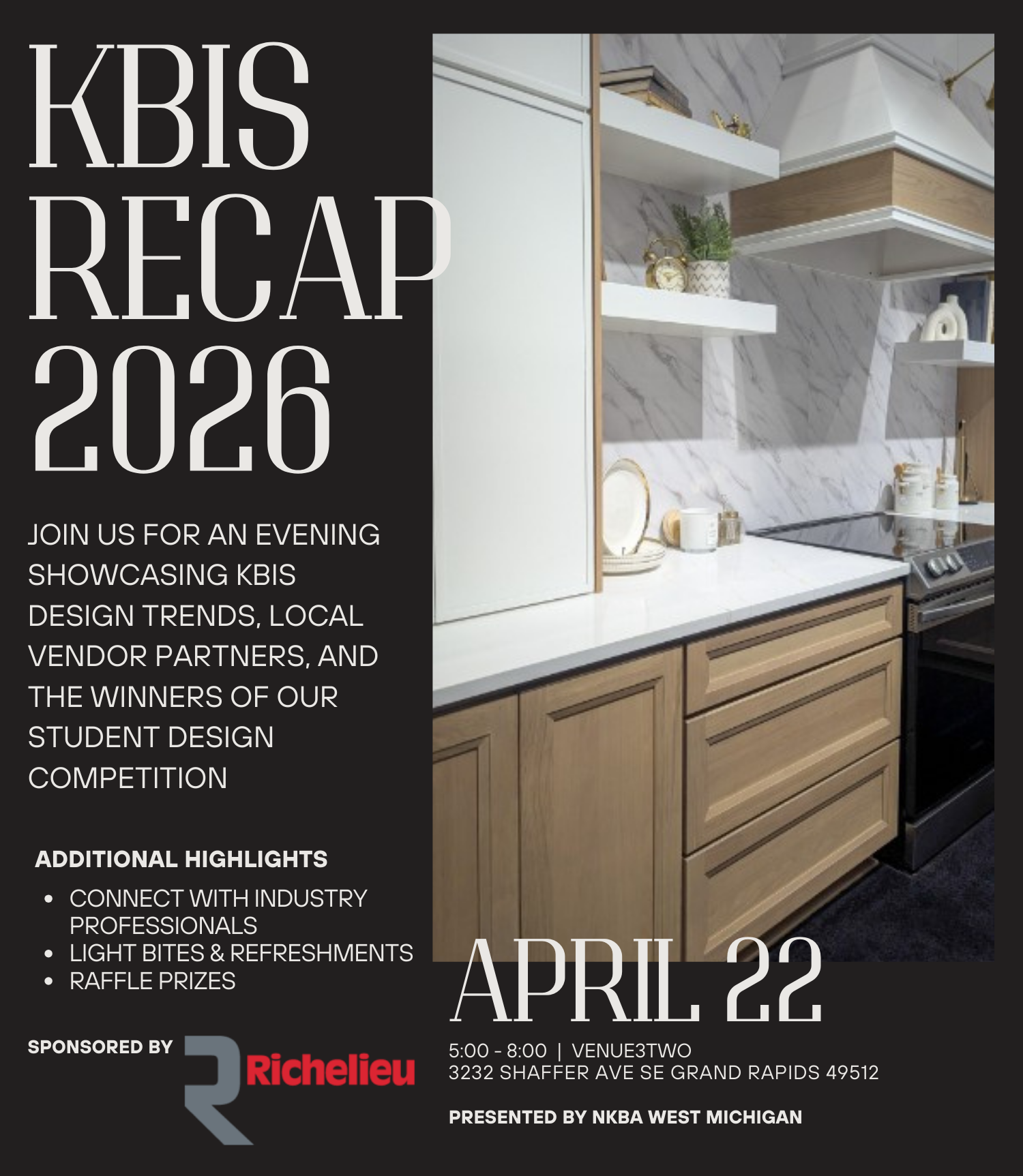 KBIS Recap Night returns for its fourth year! Join NKBA West Michigan for an evening of inspiration and connection, supported by title sponsor Richelieu and featuring a presentation on KBIS 2026 de...