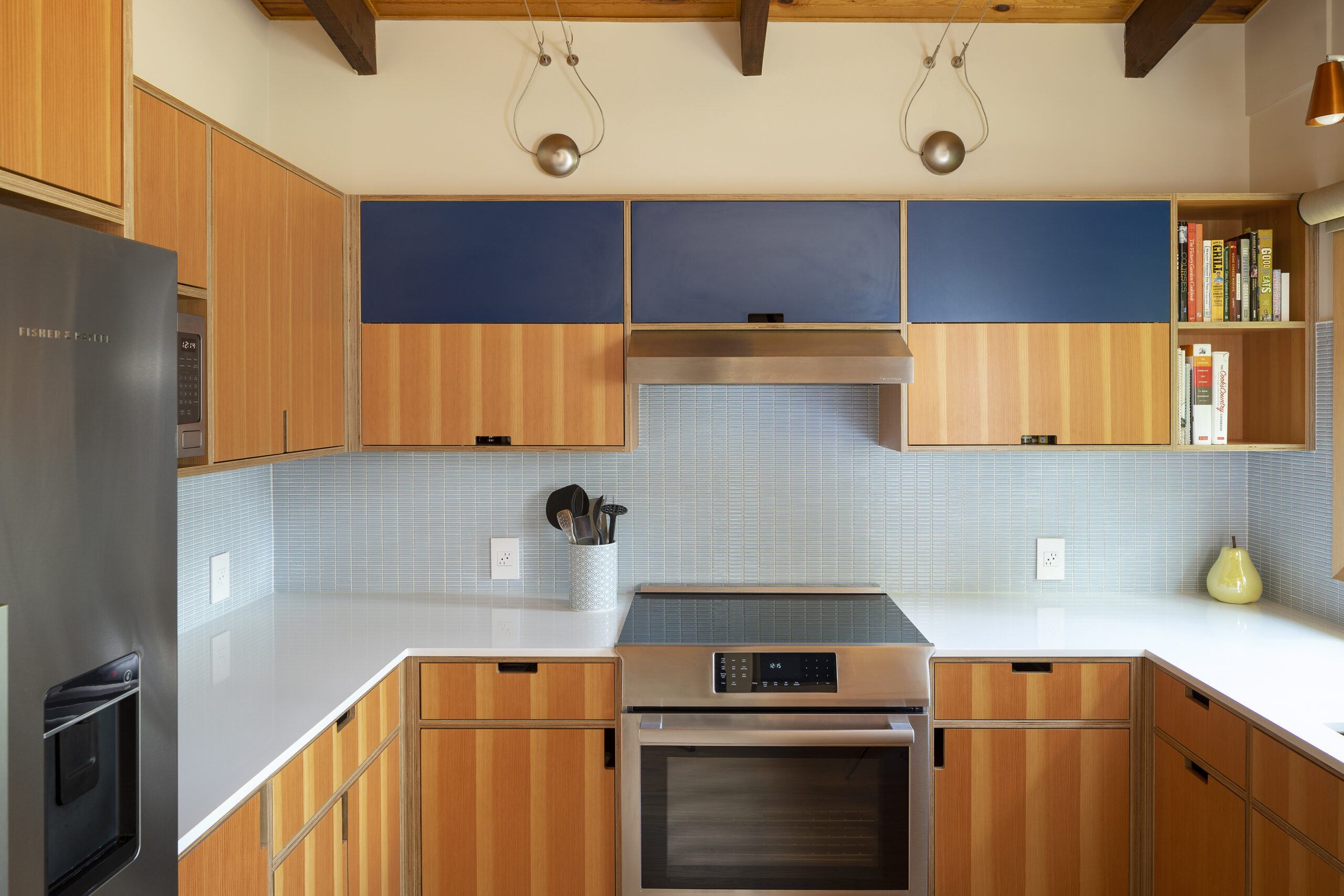 This mid-century modern kitchen designed by Paul Knutson features stacked mosaic tiles.