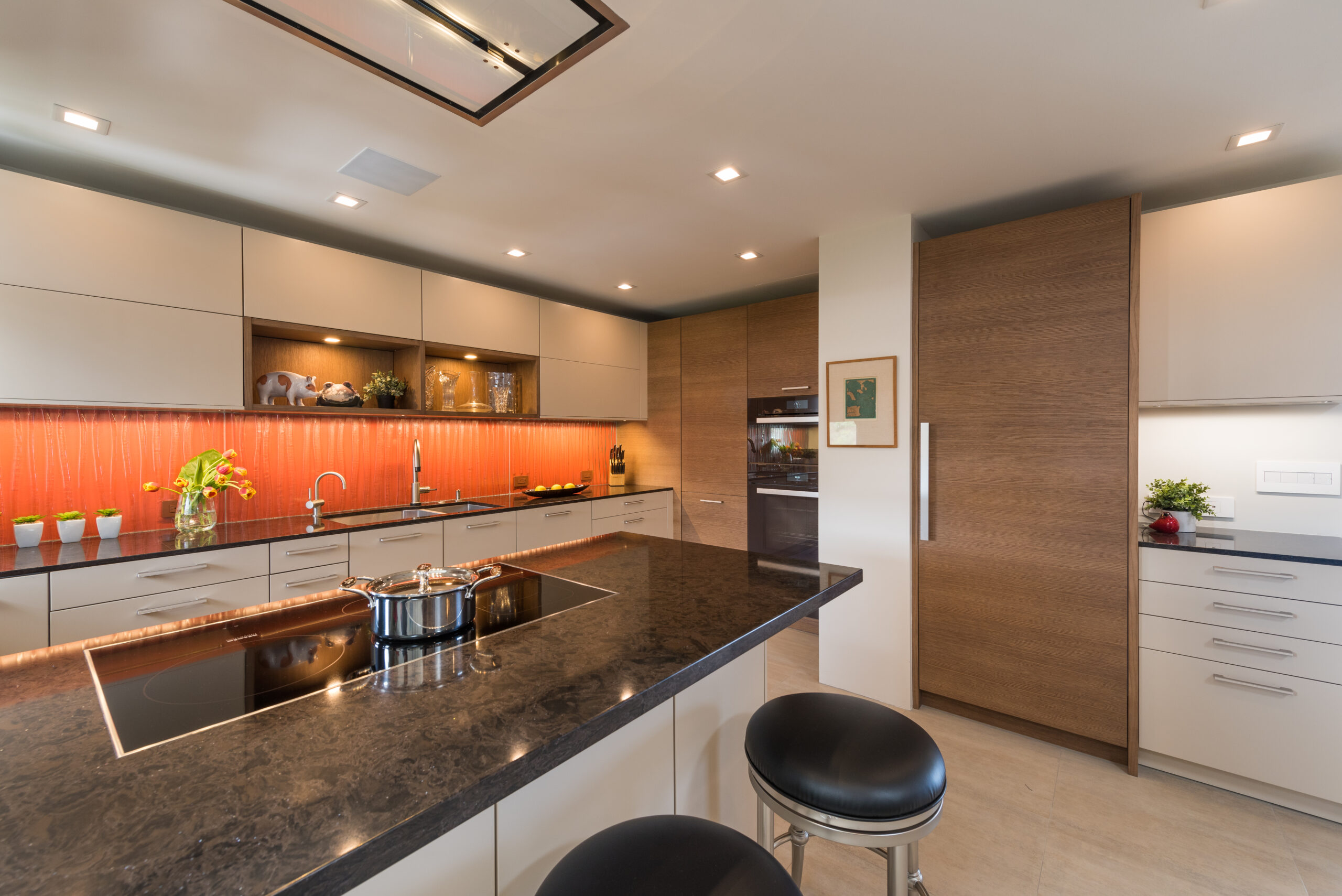 Breck Dangler, CKD,CBD, designed a gorgeous kitchen for entertaining featuring vibrant orange tile that makes a statement.