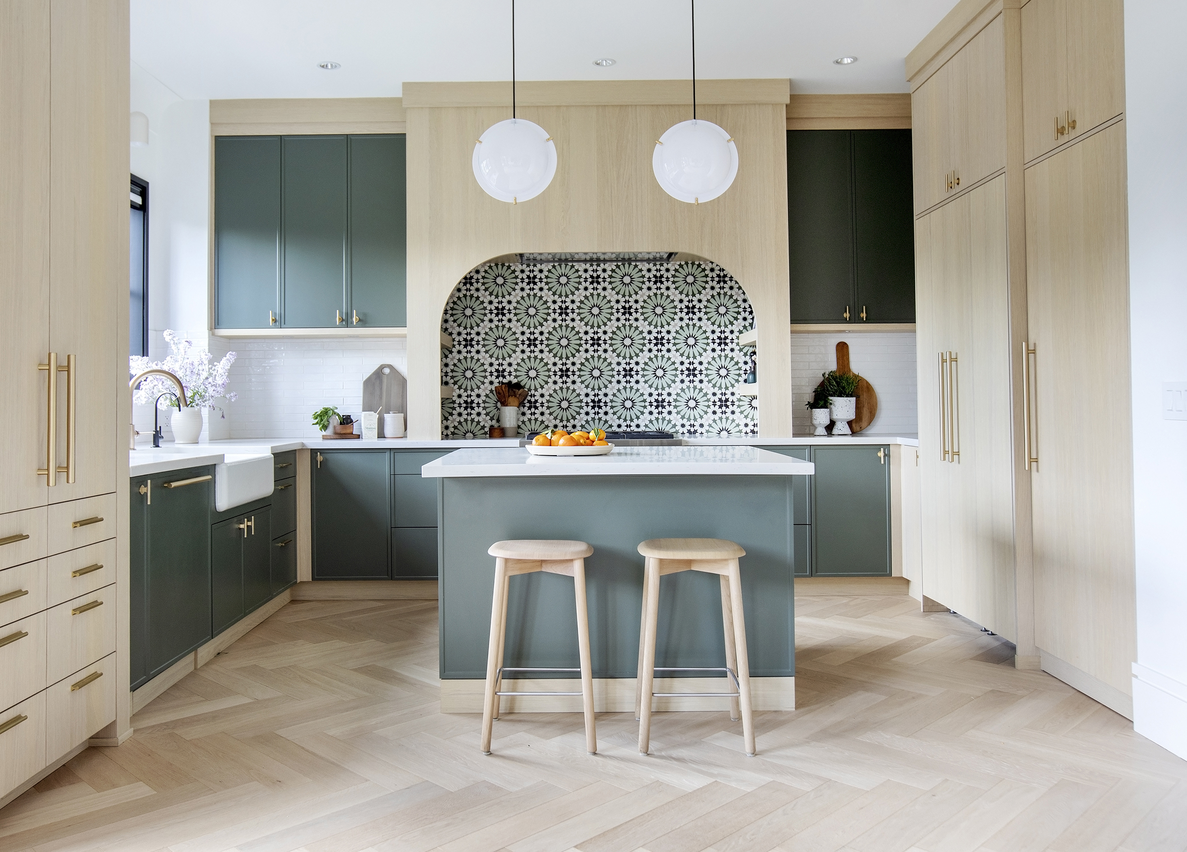 Upbeat and vibrant was the goal for this kitchen designed by Sarah Robertson. Colorful cement tiles bring whimsy into the space.
