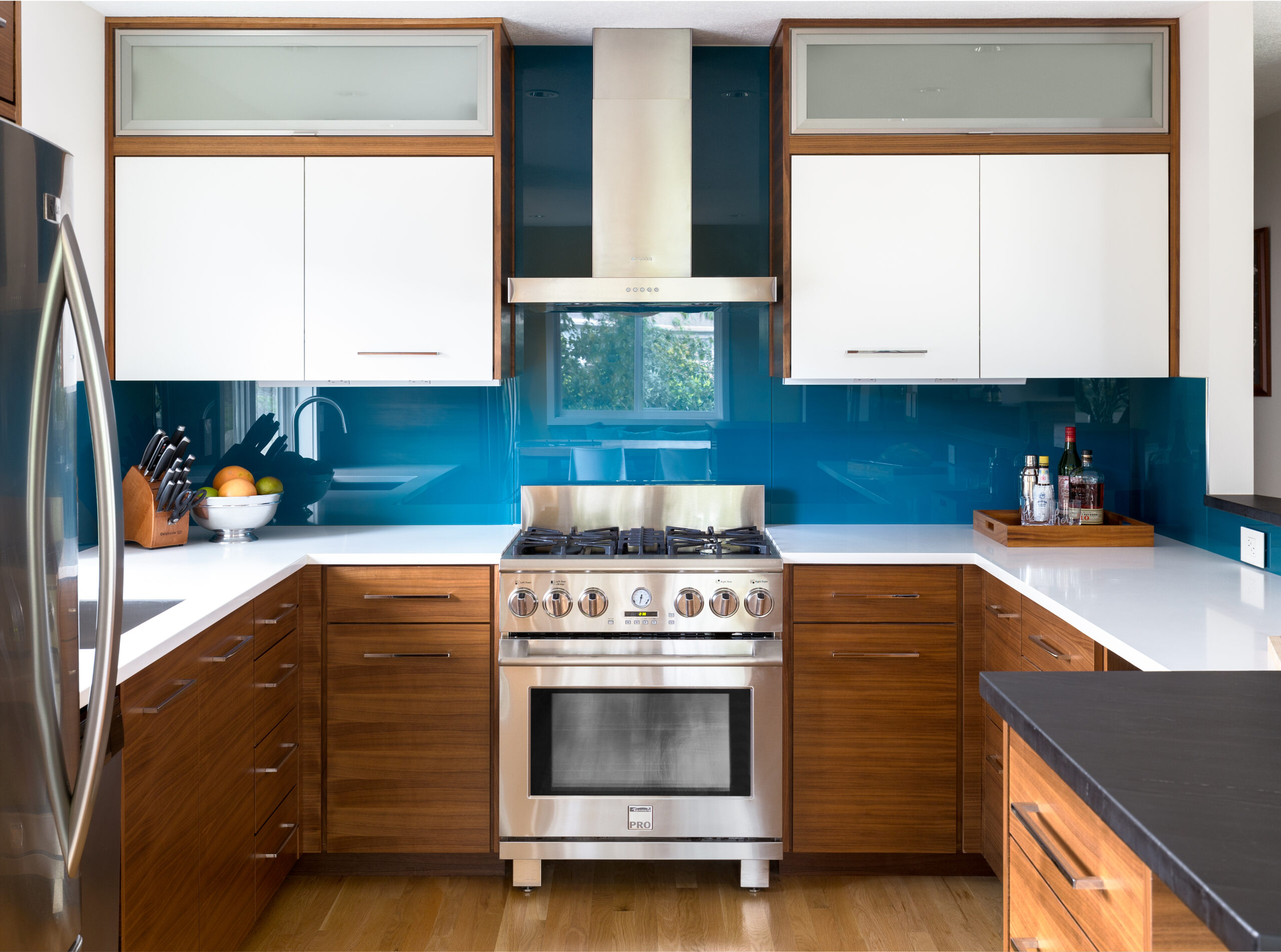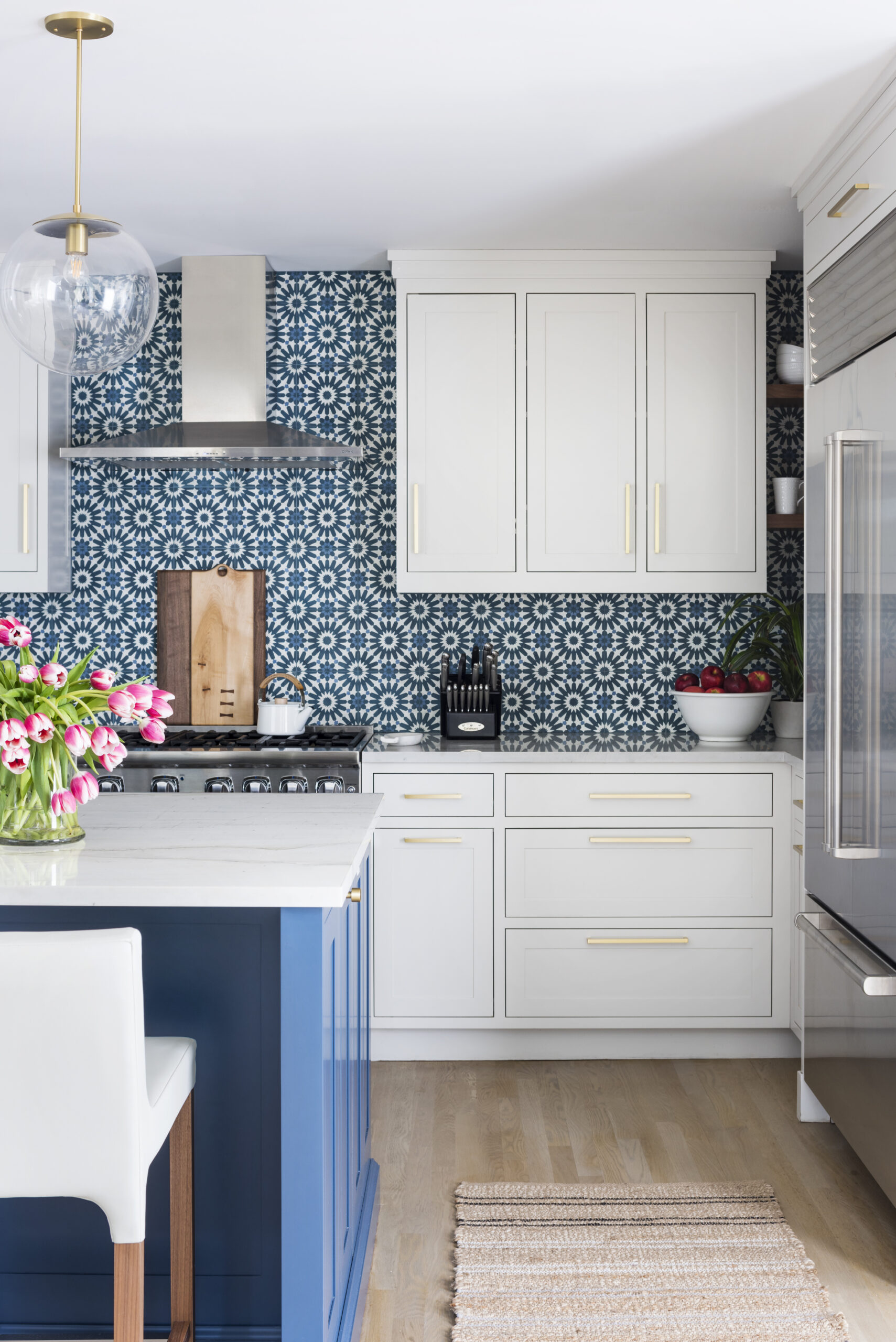 Hannah Hacker, CMKBD, added striking blue tile to this kitchen that was designed to allow more natural light into the space.