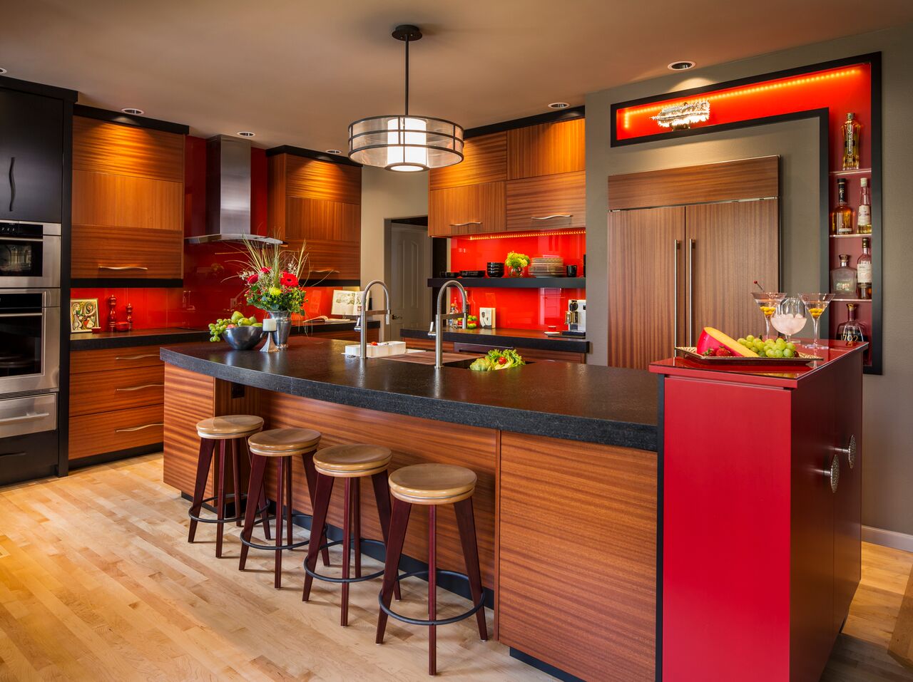 Rhonda Knoche, CMKBD’s clients are known for their flair for life, so they wanted a kitchen to reflect that. Red tile was a perfect eye-catching choice.